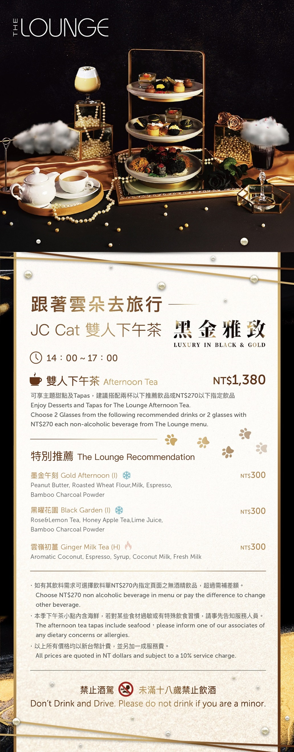 台北六福萬怡酒店七樓 The Lounge 以黑+金為靈感,11/17起推出全新「黑金雅致 JC Cat 雙人下午茶」。透過金屬光澤器皿與多層甜鹹點架,呈現精品般的午後氛圍,打造視覺與味蕾兼具的極致下午茶體驗。